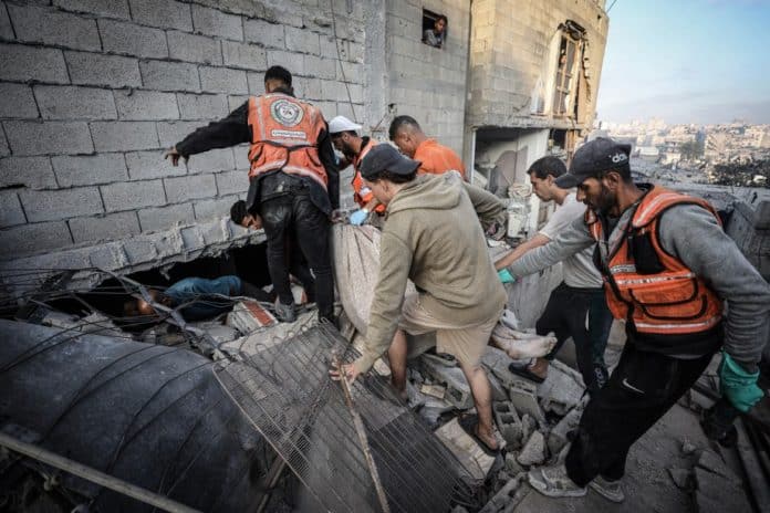 Des équipes de défense civile transportent le corps d’un Palestinien retrouvé sous les décombres dans le quartier d’ez-Zeytun, après une frappe israélienne au centre de Gaza-Sud le 29 octobre 2025