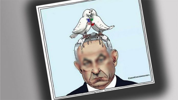 Giulio Haas, l’ambassadeur suisse en poste en Iran s’est fait taper sur les doigts après avoir, lors d’un discours prononcé jeudi dans un hôtel zurichois, présenté une caricature illustrant le Premier ministre israélien avec deux colombes déféquant sur sa tête, devant un public composé de responsables économiques suisses et iraniens.
