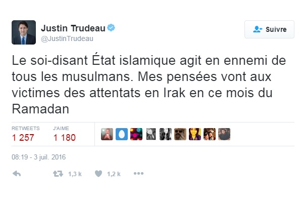 Après l’attentat de Bagdad en Irak revendiqué par Daesh qui a fait plus de 200 morts, le premier ministre canadien a tenu à rendre hommage aux victimes irakiennes en tweetant: