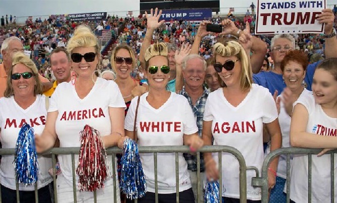 Aujourd’hui la bête a changé de couleur de peau et de religion, mais la stratégie est identique, il n’est dès lors pas étonnant de voir, lors des meeting de Trump, de «bons américains» moyens affublés de t-shirt au message sans équivoque, redonner à l’Amérique sa couleur blanche, celle d’une époque révolue mais qui tend à revenir au son des acclamations qui se font entendre de plus en plus fort.