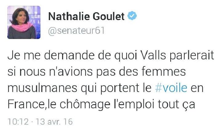 Cette nouvelle intervention du Premier Ministre a interpellé Nathalie Goulet, sénatrice de l’Orne qui a posté un tweet des plus acerbe: « Je me demande de quoi Valls parlerait si nous n’avions pas des femmes musulmanes qui portent le #voile en France, le chômage l’emploi dans tout ça ».