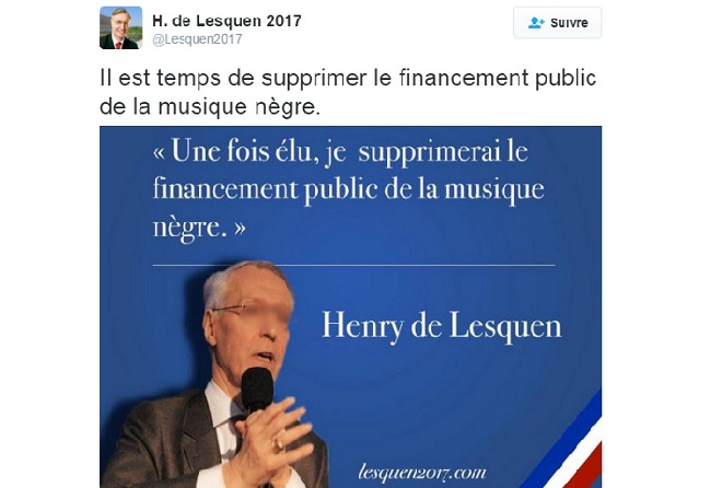 C’est une publication sur Twitter qui a déclenché une vive polémique. Ce dernier, s’il est élu, envisagerait de « supprimer le financement public de la musique nègre », rien que ça ! Les internautes se sont empressés de dénoncer ses propos profondément outranciers, mais le compte twitter précise qu’il ne s’agit que d’un « genre musical »!