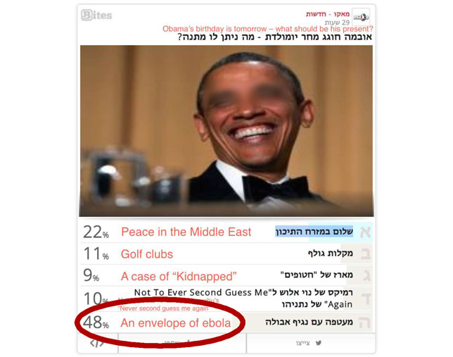En plus d’être racistes les sionistes sont ingrats ! Lors d’un sondage lancé en Israël en août 2014, 48% des israéliens ont annoncé vouloir envoyer une enveloppe contenant le virus Ebola au président des Etats Unis pour son 53ème anniversaire.
