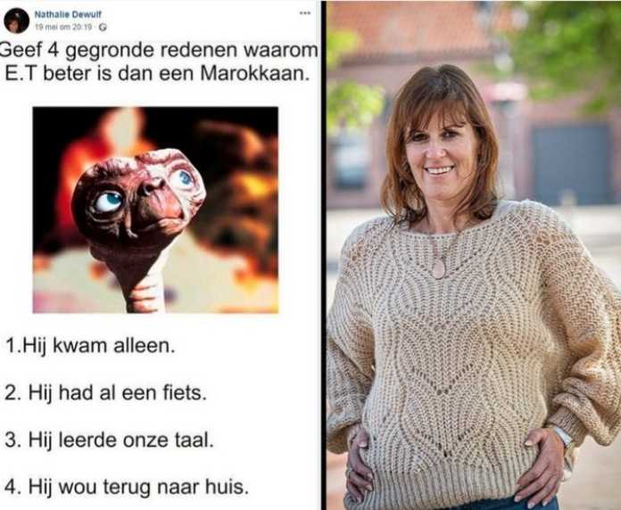 Comparant les Marocains à E.T., l’extra-terrestre, nom du film de Steven Spielberg Nathalie Dewulf écrit : « quatre bonnes raisons pour lesquelles E.T est mieux qu’un Marocain ! » :