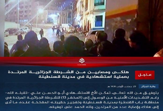 Revendiqué par le groupe terroriste Daesh dans un communiqué posté sur internet et repris par l’AFP, le texte affirme que le kamikaze est Abou El Hassan Ali et qu’il aurait « réussi à atteindre le commissariat de police de Bab El Kantara à Constantine et à y faire détoner son sac piégé » sans préciser que l’assaillant a raté son attaque.