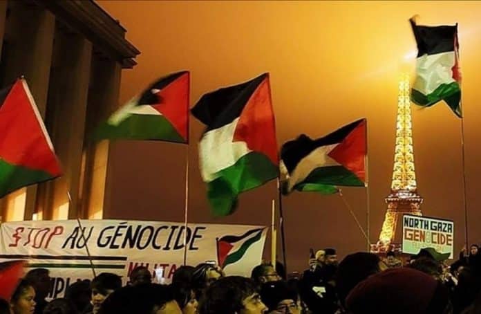 Des partisans de la Palestine se sont rassemblés sur la place du Trocadéro, près de la Tour Eiffel, appelant les autorités françaises à empêcher le gala organisé par la Fondation Israël Forever.