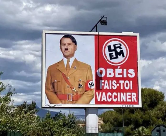 C’est un afficheur varois, Michel-Ange Fiori, qui est à l’origine de ce photomontage, visible sur deux grands panneaux publicitaires à La Seyne-sur-Mer et à Toulon, montrant Emmanuel Macron dans l’uniforme du leader nazi, affublé d’une petite moustache, avec un brassard rouge siglé LaREM. À ses côtés, on peut lire en lettres capitales : « Obéis, fais-toi vacciner. » L’objectif de l’auteur était de dénoncer la contrainte vaccinale anti-Covid, dans le contexte des mouvements de contestation contre le pass sanitaire, indique LCI.
