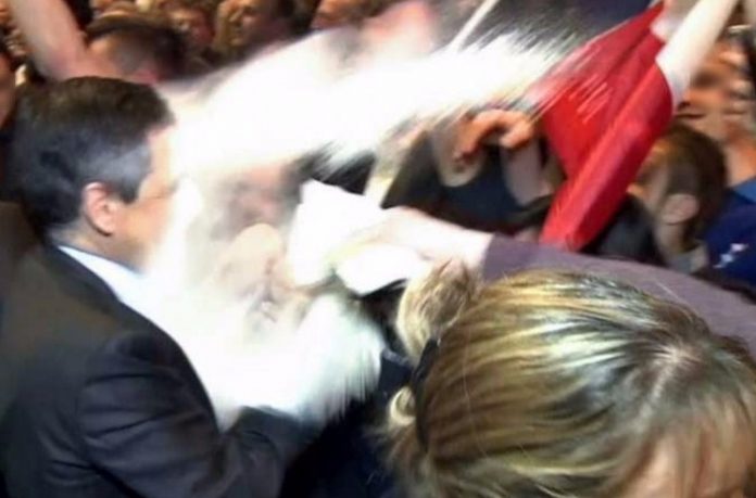Le 6 avril c’était au tour de François Fillon d’être la victime du bizutage enfariné. Face à une salle de 2.500 personnes à Strasbourg, Fillon se préparait à leur en mettre la vue lorsque deux jeunes ont fendu la foule pour atteindre le candidat et lui expédier quelques kilos de farine au visage comme le montre la vidéo.