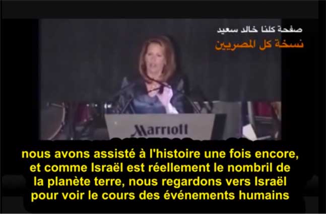 Ses paroles nous permettent d’y voir un peu plus clair dans les différents conflits de Syrie et d’Égypte. Les intérêts d’Israël sont clairement énoncés ici et ne surprendront personne. Le lobby juif (AIPAC) est maitre du congrès américain depuis toujours, Michèle Bachmann en est la preuve.