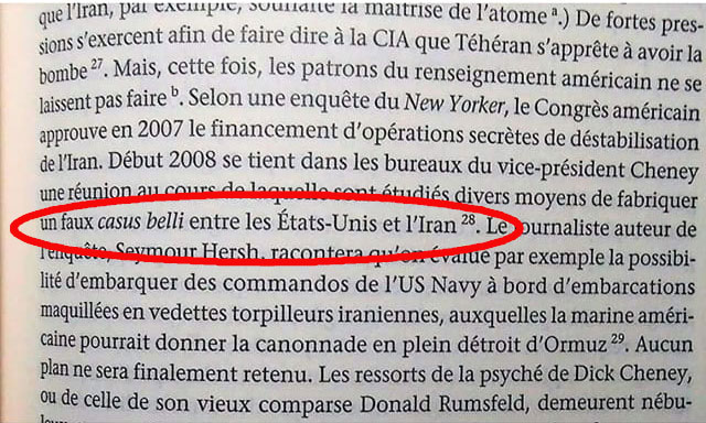 les services secrets américains étudiaient, « début 2008 », la création d’un « faux casus belli entre les États-Unis et l’Iran » et « une « opération secrète de déstabilisation de l’Iran », prenant la forme d’une attaque de pétroliers par « des commandos de l’US Navy à bord d’embarcations maquillées en vedettes torpilleurs iraniennes