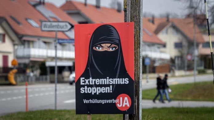 Les publicités de la campagne pour lesquelles il a payé montraient une femme portant un niqab et des lunettes de soleil à côté du slogan : «Arrêtez l’extrémisme! Oui à l’interdiction du voile. »