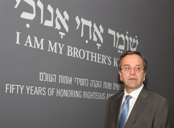 Antonis Samaras, le Premier ministre grec n’a pas voulu porter la kippa dans le Mémorial Yad Vashem. C’est un rituel en Israël de porter la kippa pour rendre hommage aux victimes de la Shoah à Jérusalem.