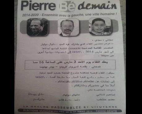 Un tract traduit en arabe, dans lequel Daniel Deleaz, candidat à la tête d’une liste PC, PG et PS, invitait à une réunion publique à Pierre-Bénite (commune de la banlieue sud de Lyon), a suscité l’indignation de son adversaire UMP, Jérôme Moroge, qui s’est dit « scandalisé » :
