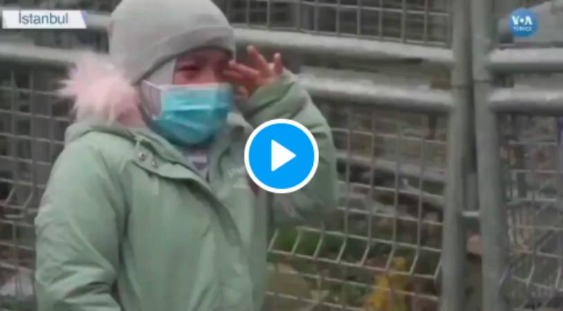 Une fille ouïghoure de 10 ans crie et demande des réponses sur les membres de sa famille disparus dans l’est du Turkestan alors que l’ambassadeur chinois en Turquie passe devant l’ambassade de Chine à Istanbul.