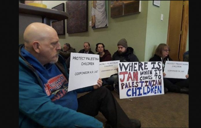 Des militants de diverses associations dont « Jewish Voice for Peace »et « American Friends Service Committee » ont occupé le bureau de la parlementaire démocrate Janice Schakowsky à Détroit pour exiger soutien au projet de loi demandant que l’aide militaire américaine fournie à Israel soit conditionnée au respect des droits des enfants palestiniens par Israel.