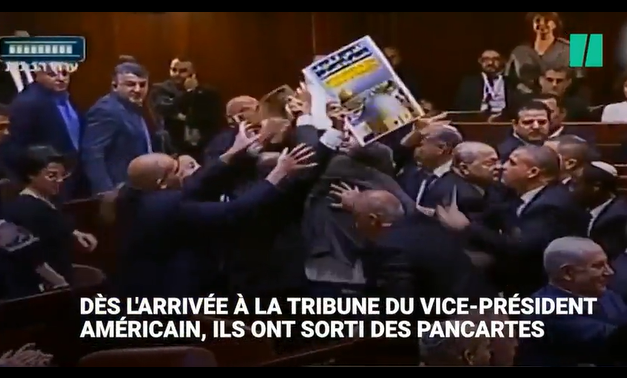 A peine arrivé sur l’estrade devant la Knesset pour annoncer la nouvelle qu’il est interrompu par des députés arabes criant haut et fort « Jérusalem capital de la Palestine » pancarte à la main. Ces derniers en viennent aux mains lorsque les députés voisins essaient de les réduire à silence.