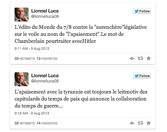 « L’apaisement avec la tyrannie est toujours le leitmotiv des capitulards du temps de paix qui annonce la collaboration du temps de guerre », ajoute-t’il. Ici il faut comprendre que le quotidien est comparé aux capitulards qui ont permis à Hitler (l’Islam) d’imposer sa tyrannie (le voile). En d’autres termes nous sommes en guerre et accepter le port du voile c’est collaborer avec l’ennemi.