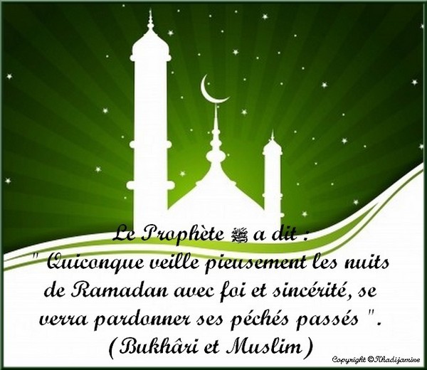 - Al-i`tikâf (la retraite) les dix derniers jours de Ramadan ne serait-ce que moins d’une heure à la mosquée ou bien accomplir les prières d’al-fajr et d’al-`ishâ’ à la mosquée ou encore la prière des tarâwîh.