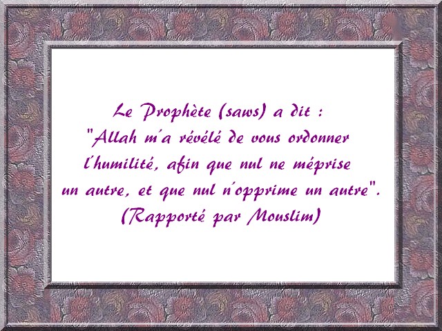 Allah m’a révélé de vous ordonner l’humilité, afin que nul ne méprise un autre, et que nul n’opprime un autre. (Rapporté par Muslim)