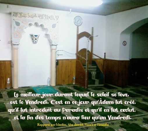 Le meilleur jour où le soleil s’est levé est le vendredi. C’est ce jour-ci où Adam fut créé, où il est entré au Paradis et où il y a été expulsé. Et il y a en ce jour une heure, où pas un seul serviteur musulman en prière ne demanderait une chose à Allah, sans qu’Il la lui donne.