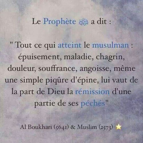 Le Prophète (Salla Allah alayhi wa salam) a dit: “Il n’est pas une fatigue ou une maladie, ou un souci, ou une peine, ou un mal, ou une angoisse qui touche le Musulman, jusqu’à l’épine qui le pique, sans que Dieu ne lui efface à cause de cela une partie de ses péchés”. (unanimement reconnu authentique) Riyad as-Salihin (Les Jardins des vertueux) de l’Imam Mohieddine Annawawi 631 – 676