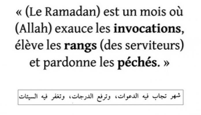 «Celui qui jeûne au cours du Ramadan étant sincère dans sa foi et afin d’en mériter les récompenses, aura ses péchés antérieurs pardonnés». (rapporté par Bukhārī Kitāb-Us-Sawm)