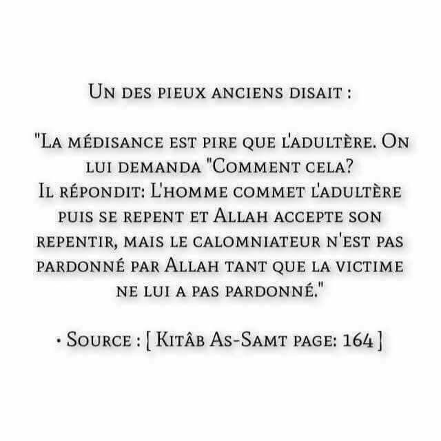 Le Messager d’Allah (Salla Allah ‘alayhi wa Salam) en s’adressant à certains compagnons a dit : “Savez-vous ce qu’est la médisance ?”. Ils dirent : “Allah et Son Messager savent plus”. Il dit alors : “C’est mentionner ton frère par ce qui lui déplaît”. Ils dirent : “Et si cela est vraiment en lui ?” Il dit : “Si ce que tu dis est en lui, tu as commis la médisance à son propos et si cela n’est pas en lui, tu l’as certes calomnié”. [Rapporté par Muslim]