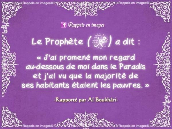 Les pauvres ne possèdent pas ce qui peut les rendre orgueilleux et arrogants. Ils sont soumis et humbles.C’est pour cela que lorsque tu médites les versets du Coran, tu verras que ceux qui s’opposaient aux messagers d’Allah et les traitaient de menteurs sont les riches et les dignitaires, et que ceux qui les suivaient sont les pauvres.C’est pour cela qu’ils entreront avant au Paradis et qu’ils y seront plus nombreux