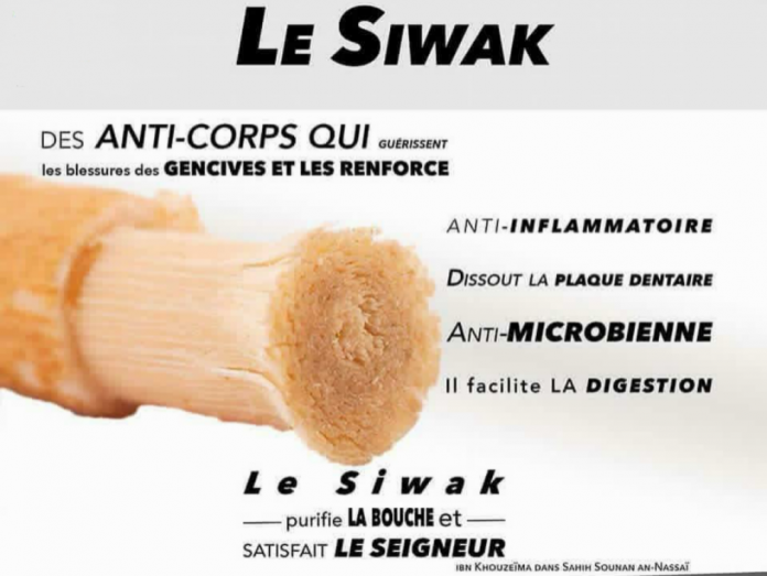 Le Siwak (le fait de se frotter les dents avec le Siwak) purifie la bouche et satisfait le Seigneur. (Rapporté par ibn Khouzeïma dans Sahih Sounan an-Nassaï (Hadith n°1202 dans Riyad as Salihine))