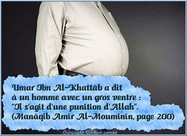 l’homme ne remplit pas d’excipient plus mauvais qu’un ventre. Le fils d’Adam devrait se contenter de quelques bouchées suffisantes pour le maintenir debout, sinon qu’il réserve un tiers pour sa nourriture, un tiers pour sa boisson et un tiers pour sa respiration (rapporté par Attirmidi et Ibn Mâjah et authentifié par Albâny.