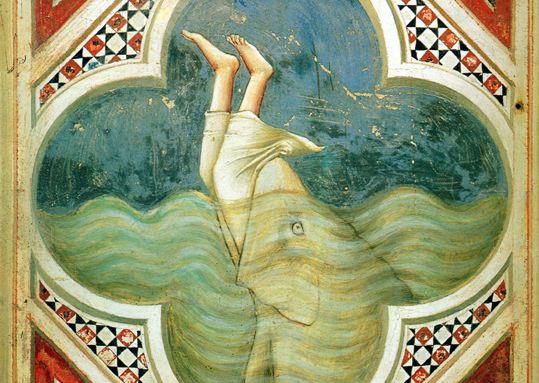 A peine avait-il sauté qu’il fut avalé par un gigantesque poisson. Ayant retrouvé ses esprits, il crut qu’il était mort et qu’il gisait dans sa tombe. Mais très vite il comprit qu’il était dans l’estomac de la bête.