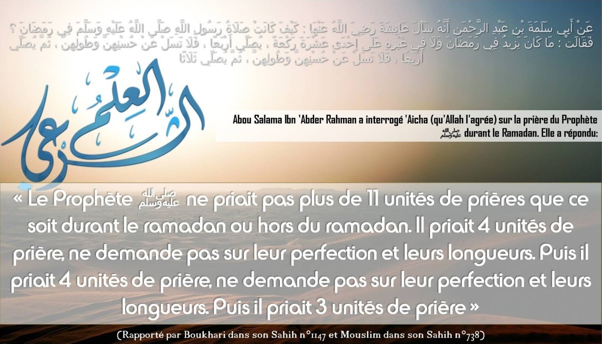 «Le Prophète (sallallahu ‘alayhi wa sallam) ne priait pas plus de 11 unités de prières que ce soit durant le ramadan ou hors du ramadan. Il priait 4 unités de prière, ne demande pas sur leur perfection et leurs longueurs. Puis il priait 4 unités de prière, ne demande pas sur leur perfection et leurs longueurs. Puis il priait 3 unités de prière» .(Rapporté par Boukhari dans son Sahih n°1147 et Mouslim dans son Sahih n°738)