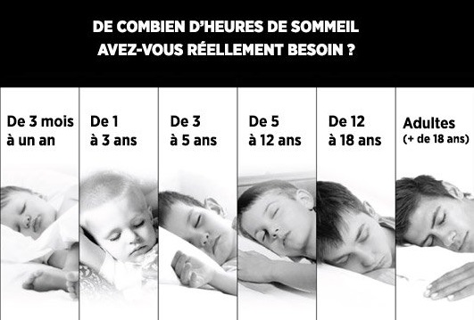 Une infographie réalisée par l’Institut national du sommeil donne un aperçu du nombre d’heures que nous devrions dormir pour être au top et ce compris le temps de siestes.