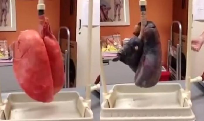 On y voit deux poumons soumis à l’expérience de la respiration, celui d’un fumeur et celui d’un non-fumeur.