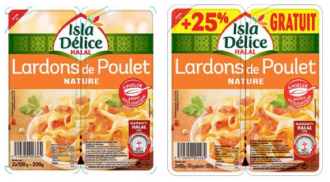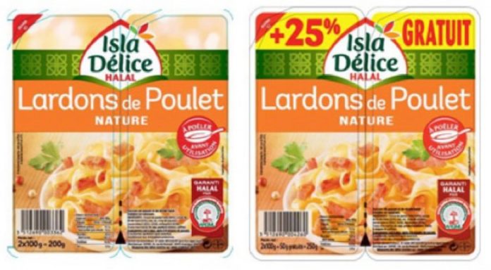 – Nom du produit : Lardons de poulet nature 200 g et 200 g +25 % gratuit