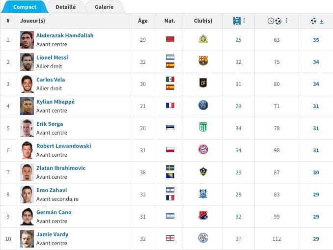 Ce qui place Abderrazak Hamdallah devant l’attaquant du Bayern Munich Robert Lewandowski (54 buts) et Lionel Messi (50 buts). Derrière eux, on trouve notamment Kylian Mbappé (44 buts), Raheem Sterling (41 buts) et Cristiano Ronaldo (39 buts).