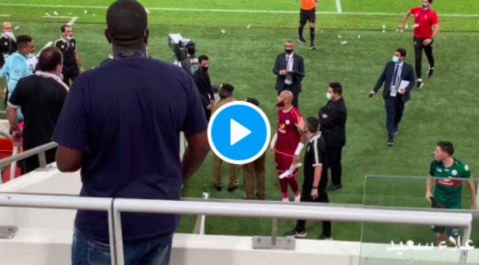 Retenu par des joueurs et des membres du staff, le vainqueur de la CAN 2019 a alors perdu ses nerfs et lancé une bouteille d’eau en direction de son adversaire !