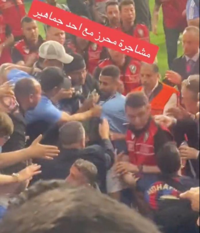 Dans une ambiance assez tendue, un supporter s’introduit sur le hall menant au tunnel et s’en prend violemment à Riyad Mahrez. Les agents de sécurité encadrent rapidement le joueur de Manchester City pour l’éloigner du danger. Un deuxième supporter avance vers lui pour en découdre.