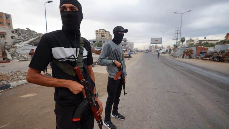 Des membres des forces de sécurité internes fidèles au Hamas contrôlent un point de contrôle dans le camp de réfugiés de Nuseirat, au centre de la bande de Gaza, le 12 octobre 2025.