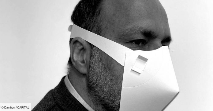 Chacun de ses masques serait vendu 50 centimes pièce. Ayant la forme d’un cône en papier de fort grammage, le masque serait vendu en kit, jetable et recyclable. Et serait produit par millions chaque mois.